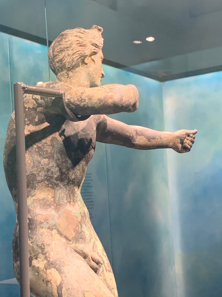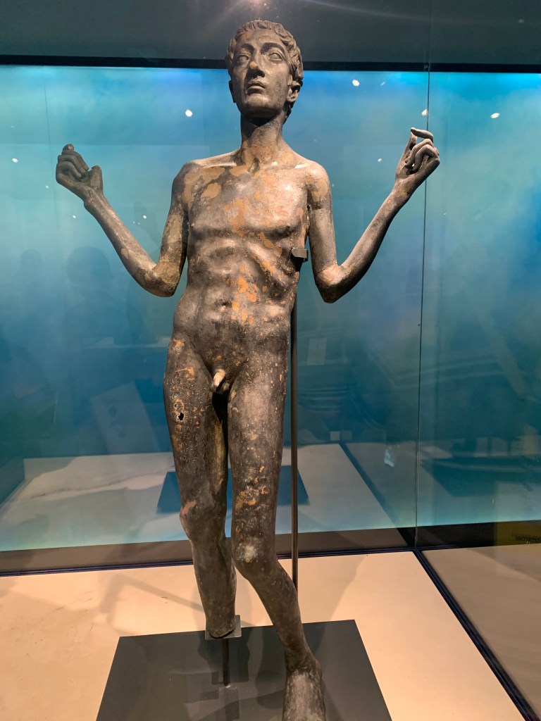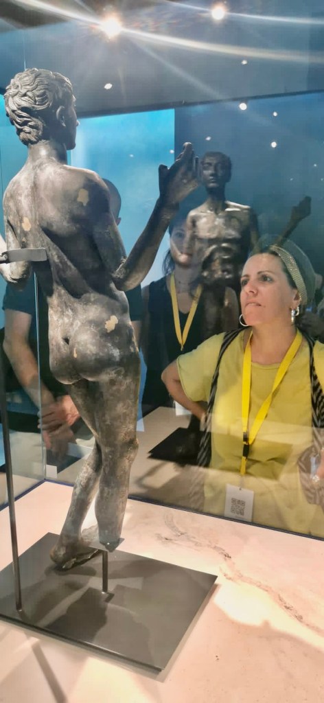 Dalla sala 4 in poi sarete a tu per tu con le sculture di bronzo. A questo punto l’esposizione è una sequenza di pezzi, uno o due per sala, al centro dello spazio, circondati dall’azzurro dell’acqua che ha lo scopo di simulare il luogo di ritrovamento. L’orante, Marco Grabillo, il togato, Apollo e infine l’ultima sala con gli ex voto.