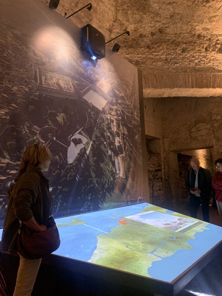 Mi ha colpito positivamente, però, l’installazione di un grande pannello con la ricostruzione 3D della Domus Aurea tutta, che quindi mostra per la prima volta in questo sito e in modo ben comprensibile tutti gli edifici di cui era costituita: il palazzo sul Palatino, il vestibolo sulla Velia, lo Stagnum nella valle, il padiglione estivo sull’Oppio e il ninfeo sul Celio, oltre alle precedenti proprietà già parte della Domus Transitoria, come i giardini di Mecenate sull’Esquilino. Ho appreso che il pannello è stato introdotto nel momento in cui il percorso di visita è stato decurtato della parte iniziale con il video introduttivo. Ah ecco, mi pareva troppo bello.