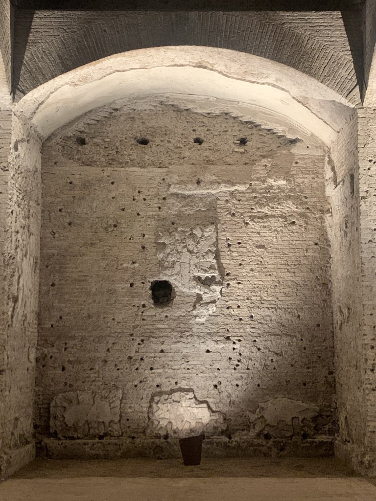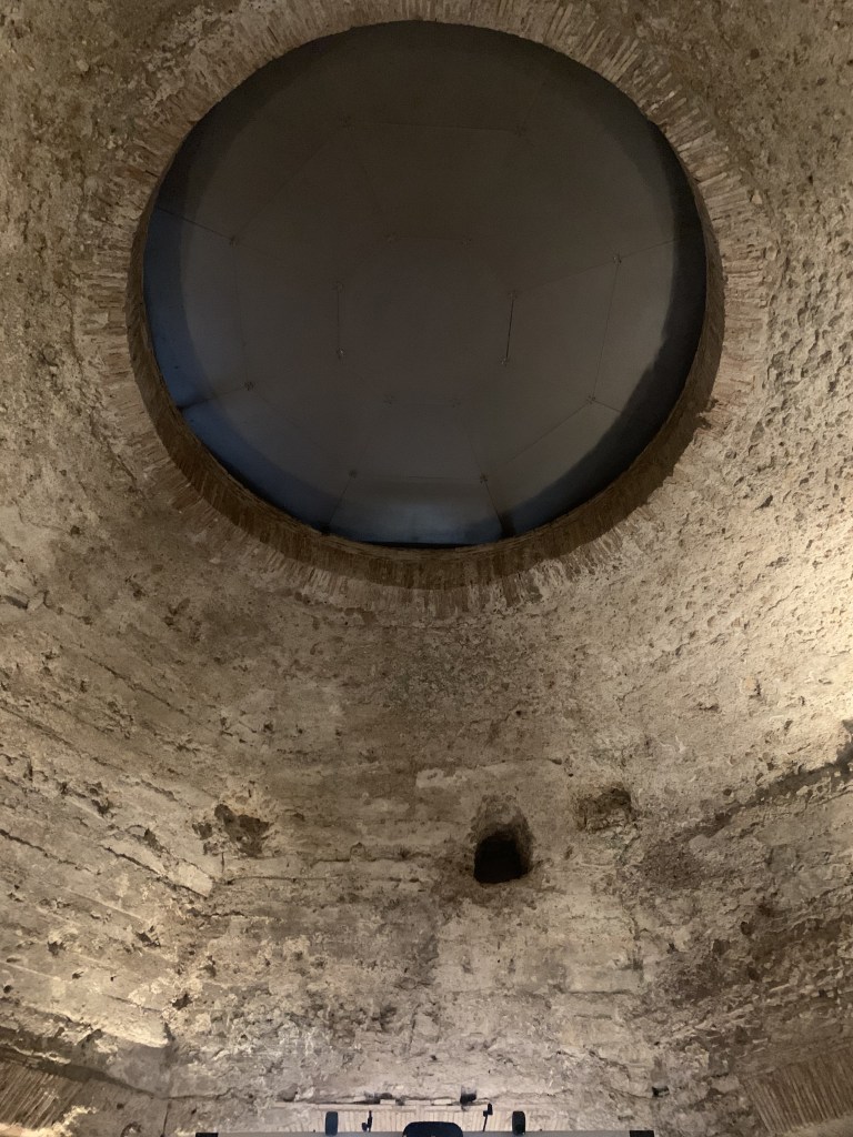 La sala a otto lati sul colle Oppio, per anni creduta QUELLA sala rotante, non ha in realtà nessun elemento per poter confermare l’ipotesi. È una struttura in muratura, salda, con una ampia porta verso l’esterno collegata visivamente con il ninfeo del Celio, all’esterno, e con la cascata artificiale retrostante, una copertura voltata che è un capolavoro dove le uniche tracce realmente indiziarie dell’uso antico sono la superficie non finita e dei forellini forse usati per applicare tendaggi preziosi (sì, io credo a questa lettura). Il resto sono tracce post antiche legate alle spoliazioni perchè intaccano la copertura e non avrebbero senso nel cantiere antico.