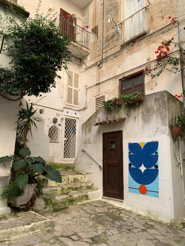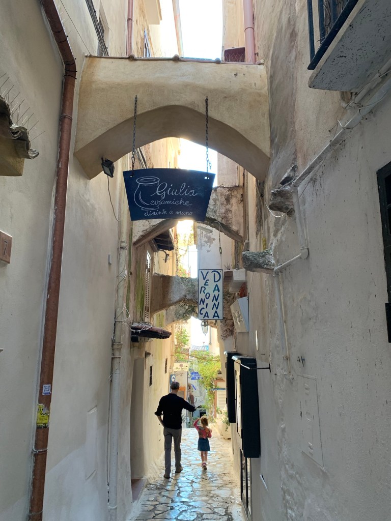 La sola cosa da fare è dirigersi per una delle scale che scendono a mare, e che, in realtà, girano attorno e all’interno del borgo. Ad ogni angolo vi coglierà di sorpresa un profferlo, la tipica scala esterna di origine medievale, sorretta da archetti su mensole. In pratica nasce spesso in legno, addossata alla facciata verticale della casa torre. Qui a Sperlonga sono in muratura e svolgono la stessa funzione: fornire un accesso esterno.