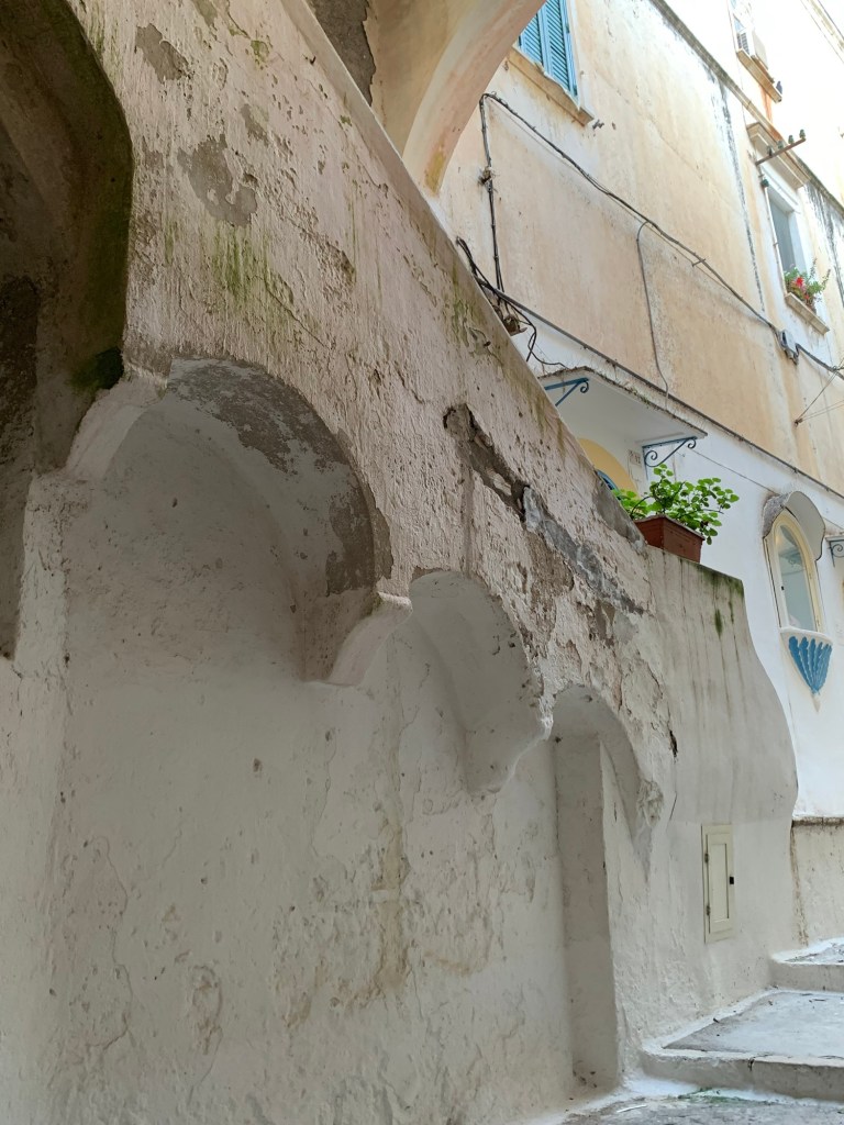 Il paese è scialbato, le facciate sono tutte, giustamente, coperte da uno spesso strato di calce bianca perché questo protegge le murature dagli agenti atmosferici e specialmente dagli schiaffi salati che giungono dal mare.