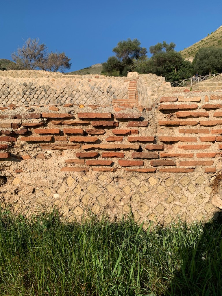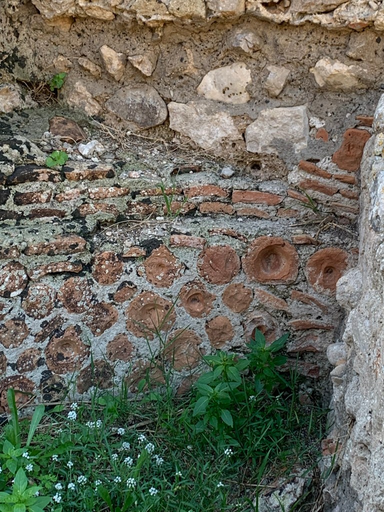 Si osservano, poi, numerosi interventi successivi, sia in mista di reticolato e laterizi (presumo dei secoli centrali dell’età imperiale), sia mista tarda, con elementi di reimpiego della fase “d’oro”. Qui, ci guidano le colonnine in mattoni messe di traverso a fare un muro divisorio, oppure fondi di anfora e coperchi a fare da paramento.