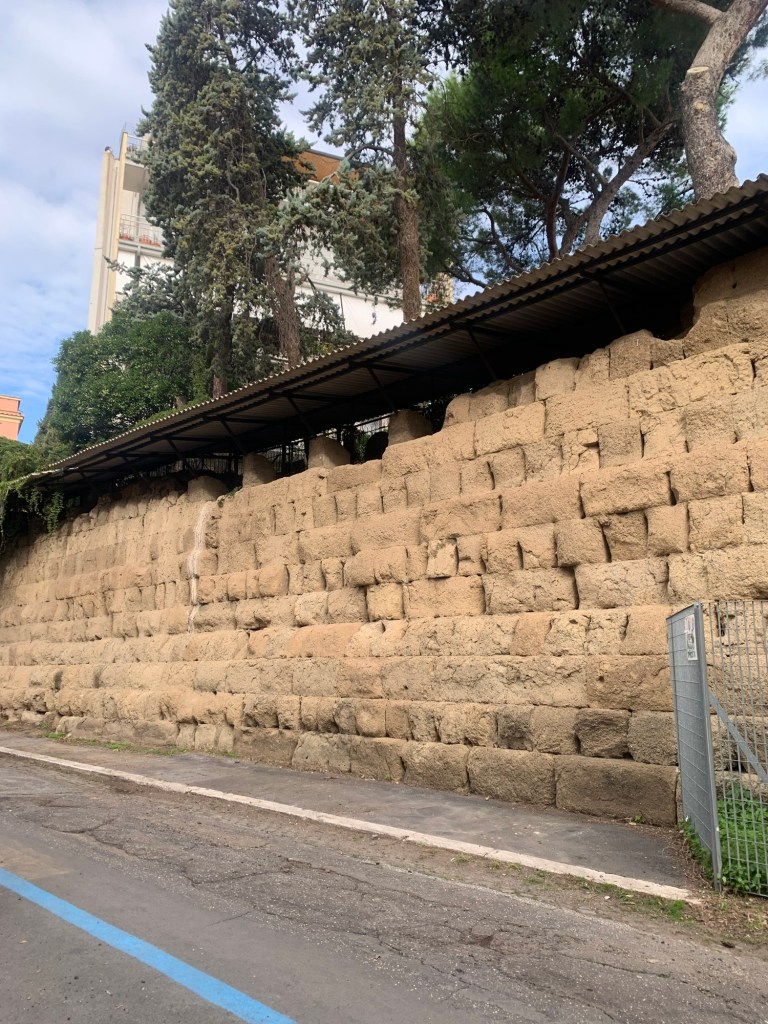 Cosa stiamo guardando? Esattamente, un tratto delle Mura dette Serviane, ricostruite all’inizio del IV secolo a.C. in tufo giallo di Grottaoscura.