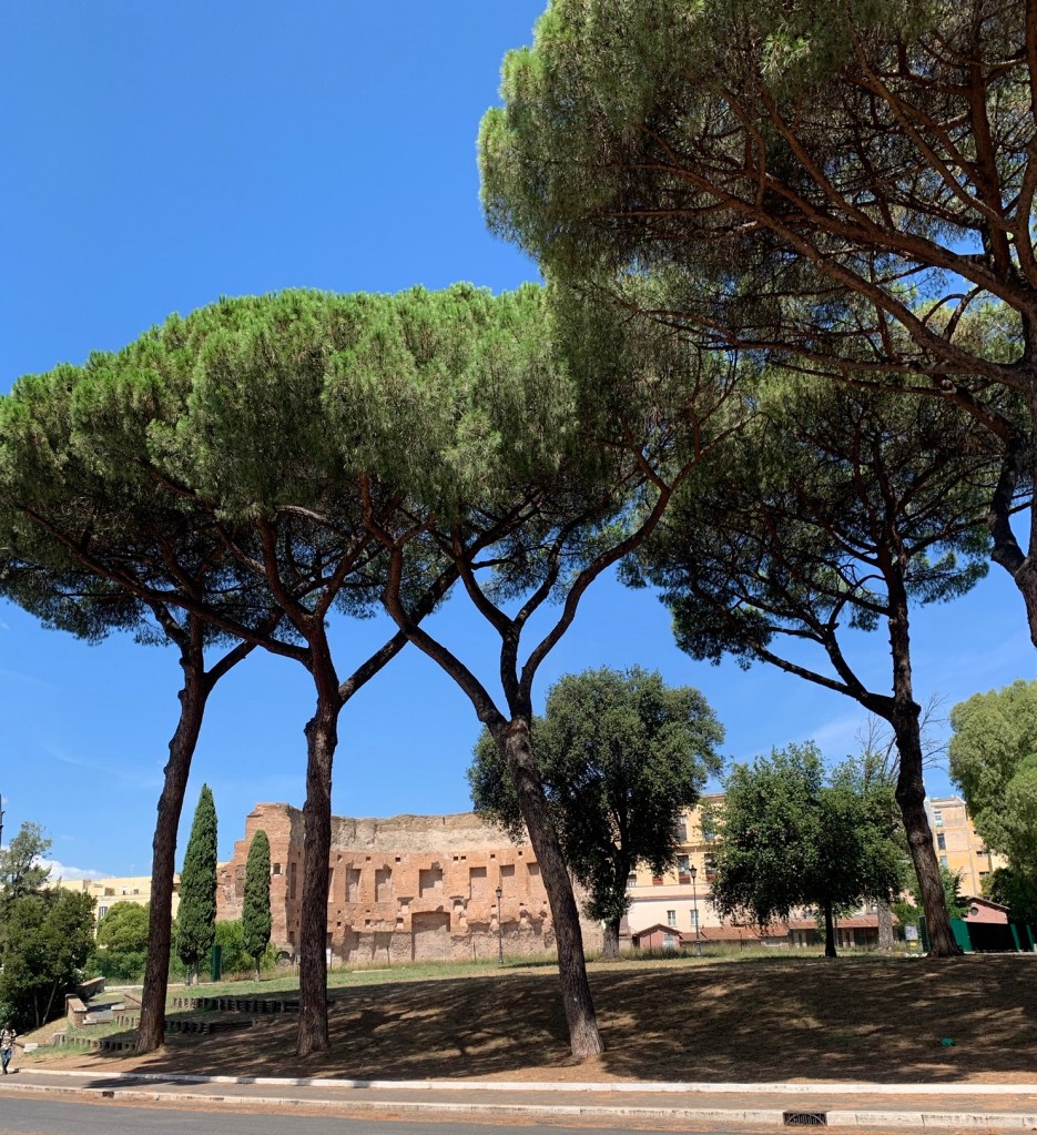 Quando si sale sul Colle Oppio e ci si guarda intorno ci sono tre cose “archeologiche” che catturano l’attenzione: a valle, il Colosseo; a monte, l’ esedra del recinto delle Terme di Traiano. Più oltre, la Domus Aurea segnalata dai capannoni bianchi del cantiere di restauro. Non si vede ma c’è.
