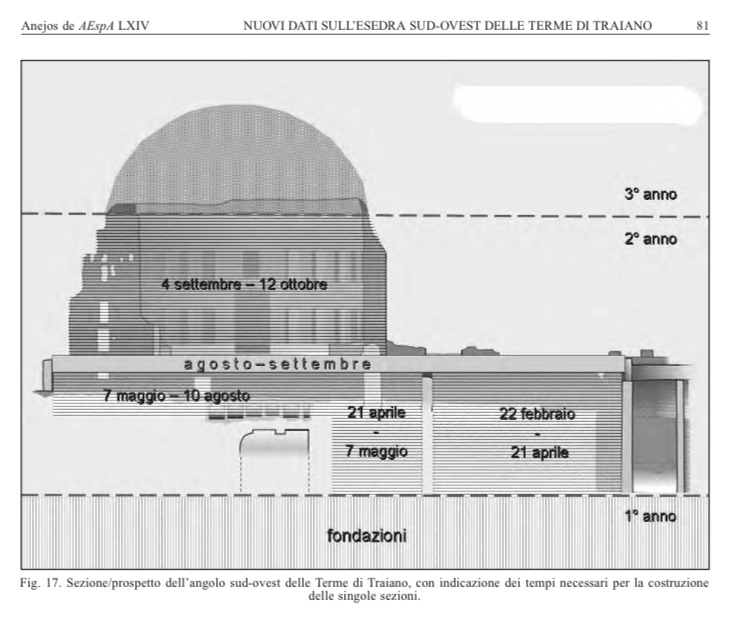 C’è voluto un anno per completare le gallerie di sostruzione. Ce ne sono voluti due per tirare su l’esedra, fino all’imposta, e la volta a catino, che però oggi non si conserva.