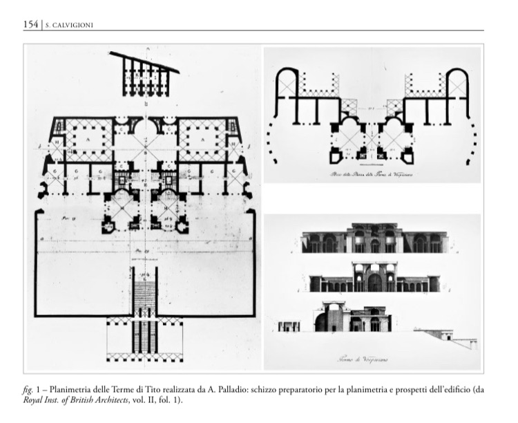 La Calvigioni, infatti, ci racconta che altri due famosi antiquari del tempo, tra i quali Pirro Ligorio, nelle loro vedute di Roma distinguono regolarmente i due edifici termali, Terme di Tito e Terme di Traiano. Tuttavia, il problema è poter stabilire la reale consistenza dell’edificio di età flavia (ricordate la sola fondazione cementizia?), come pure accettare per buona la inventata planimetria palladiana.