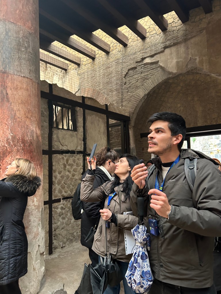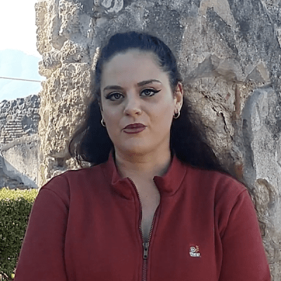 - Emanuele Fusco, archeologo, laureando magistrale in archeologia italica è un profondo conoscitore della policromia della statuaria, perché se ne è occupato negli studi universitari triennali. Lo abbiamo ascoltato a Ercolano e ci ha incantati con le storie dipinte sui muri. A Pompei ci racconterà tutto quello che avremmo sempre sognato sapere sulla pittura, le architetture dipinte e la scultura.