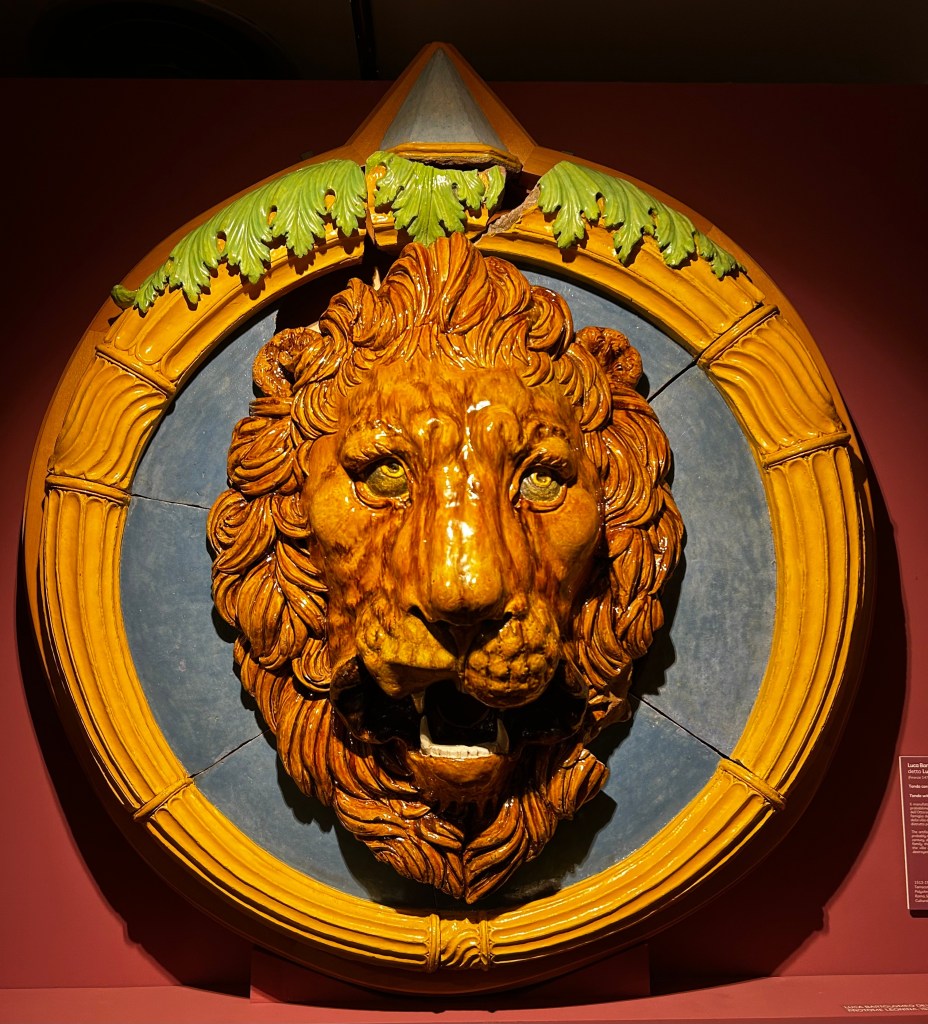 Catturerà la vostra attenzione uno dei leoni in ceramica dipinta di Luca della Robbia originariamente posto a decorare il cinquecentesco palazzo Silvestri-Rivaldi lungo l’attuale via dei Fori Imperiali. L’opera fa parte di una serie di tondi decorativi con imprese medicee, cioè simboli araldici della famiglia Medici, conservati al Museo di Roma, dove giunsero nel 1957 dal Museo Artistico Industriale. Le opere decoravano probabilmente un ninfeo nel giardino del palazzo del Cardinal Alessandro De’ Medici, futuro papa Leone XI. Il complesso fu demolito intorno al 1933 in occasione dell’apertura di via dell’Impero.