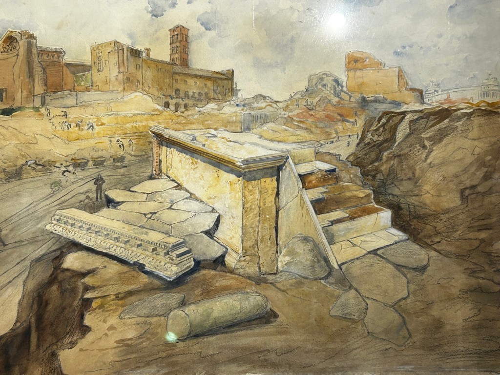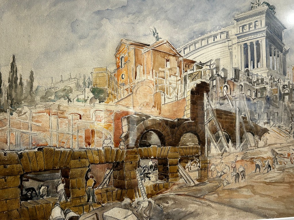 Tra le storie più memorabili, la scoperta del Compitum Acilium, un sacello di età augustea costruito presso la Velia e spazzato via durante gli scavi per via dell’Impero insieme alla collina stessa. Il Compitum, come ci ha raccontato Andrea Grazian in mostra, era uno dei circa 300 attestati dalle fonti antiche. Ad oggi ne sono stati identificati solo tre. Di questo sacello, Maria Barosso ha eseguito il rilievo, la restituzione grafica e un acquerello dello stato di fatto al momento della scoperta. E in questa mostra si constata come per quanto sia “asettica” e fredda la rappresentazione grafica tecnica al tratto, sono decisamente drammatici, per tutta la potenza narrativa che portano con sé, gli acquerelli a colori.