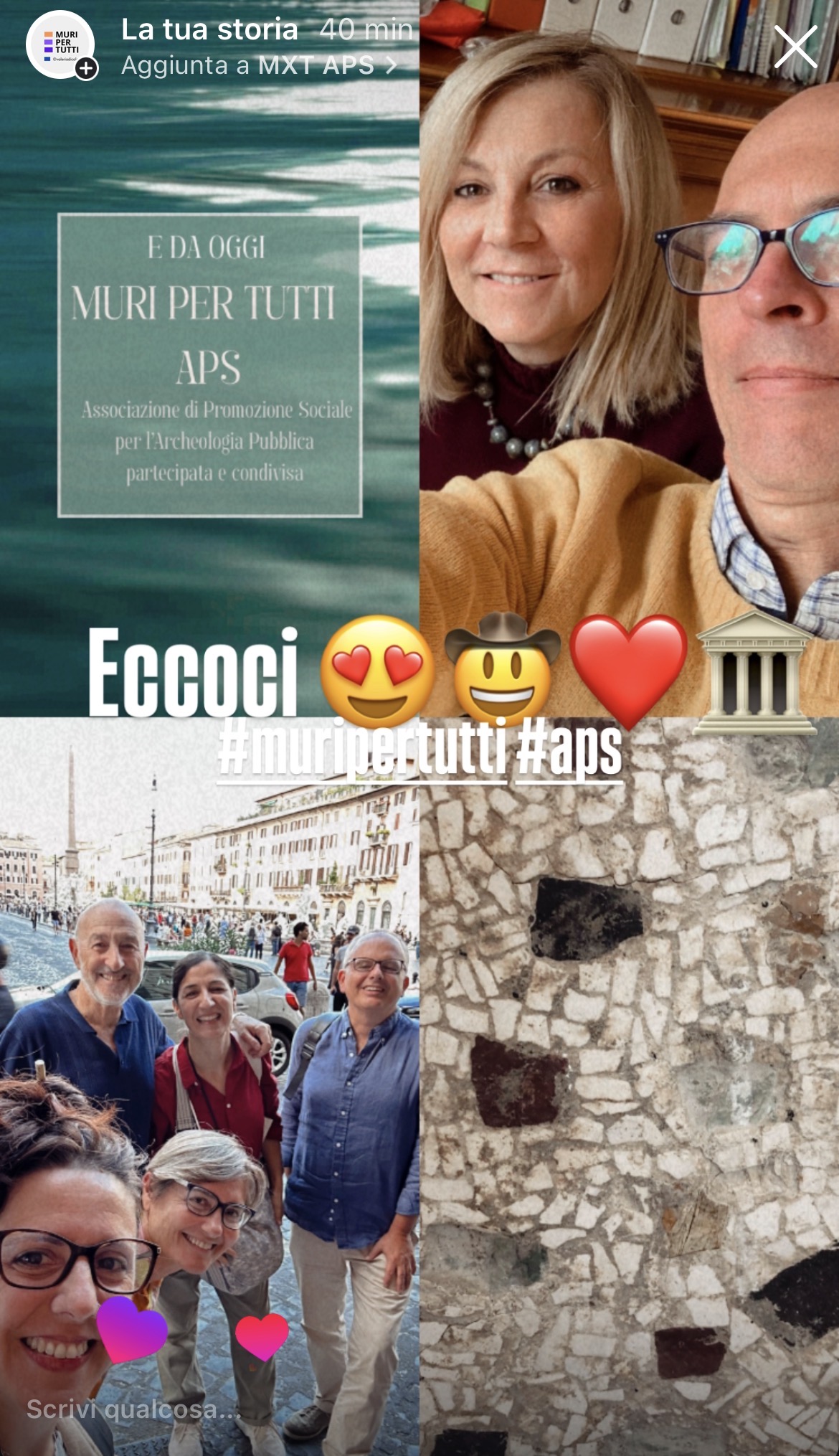 E qui il progetto si manifesta per quello che è: una formula reale e concreta di archeologia pubblica dal basso, dove per “basso” si intende la base, la fondamentale base di appoggio e consenso senza la quale nessuna professione che ambisca ad essere rivolta al pubblico può avere senso. E così, con Alessia D’Agostino, Fabiola Scascitelli, Vincenzo Rossi e Domenico Formichelli, e con il supporto dei colleghi e compagni di una vita, Ilaria De Luca e Alessandro Delfino, abbiamo costituito una Associazione di Promozione Sociale, che abbiamo chiamato, pensate un po’, MURI PER TUTTI APS.