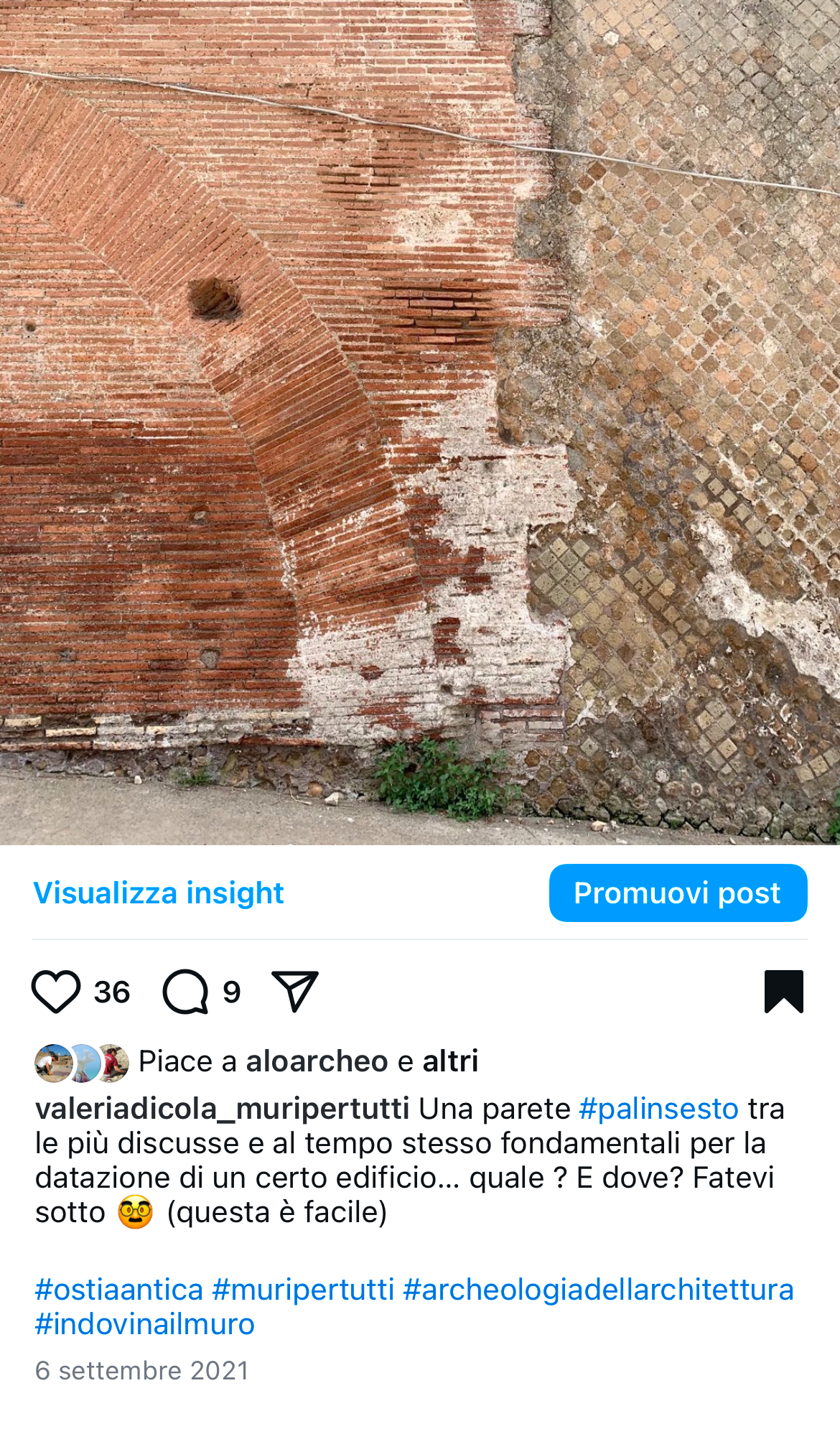 Qui, confesso, l’emozione mi travolge. Meno male che sto scrivendo e non si vede. Era il 2021, come ho spesso ripetuto, quando ho lanciato il primo post su un muro di Ostia antica su Instagram, sul mio profilo personale, che destava di per sé poco interesse e aveva, quindi, seguito praticamente nullo. Il post lanciava una domanda: riconoscete questo muro? All’epoca ero ricercatrice di ruolo a Roma Tre e partecipavo a un progetto sulla ricostruzione della forma urbis di Ostia antica. Dentro di me pensavo: ma come posso coinvolgere la comunità internazionale non specialistica su queste magnifiche storie murarie del passato? E così lanciavo la domanda e creavo per l’occasione l’hashtag #guessthewall e #muripertutti