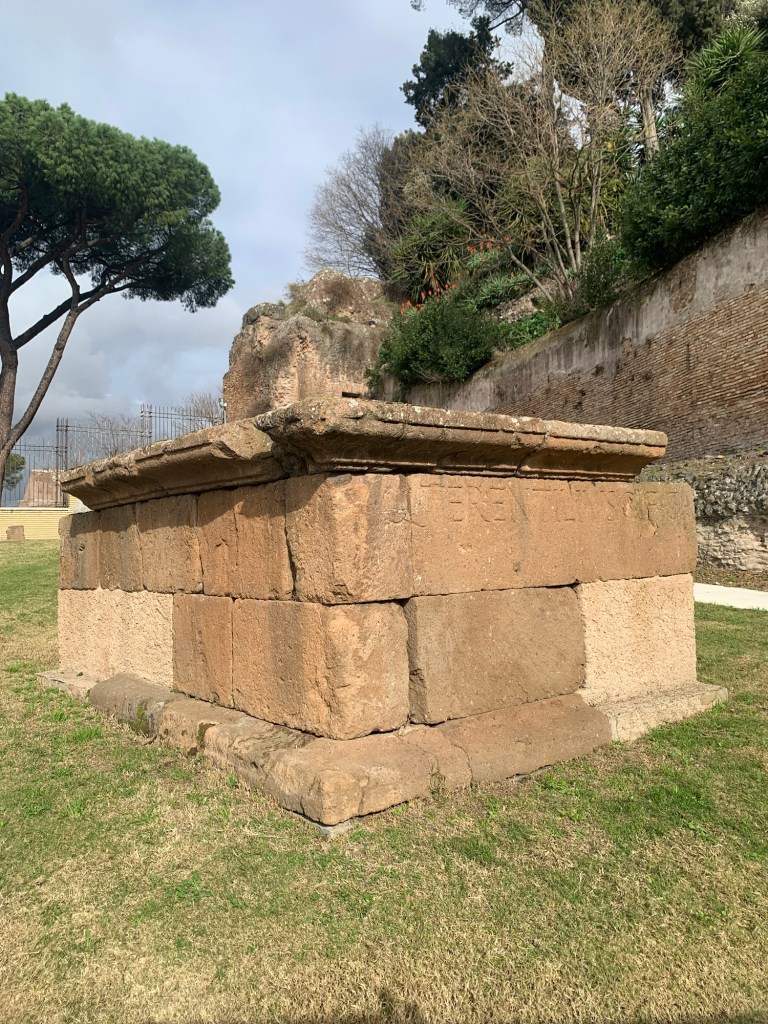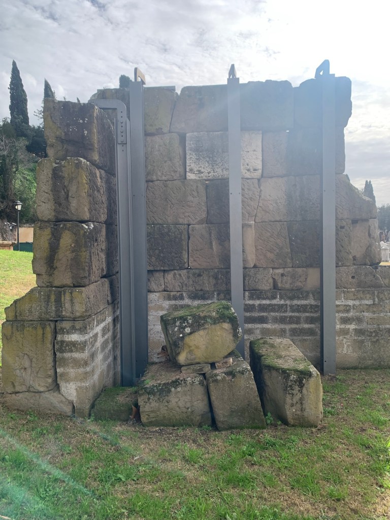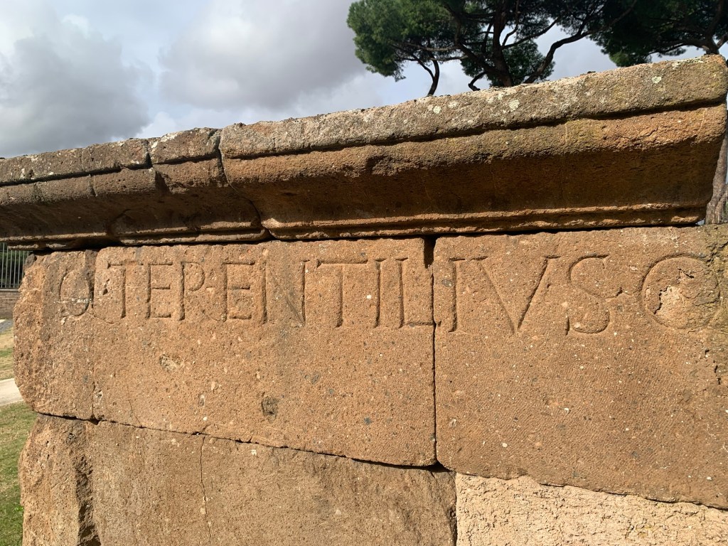Le vedrai, sono due grandi “scatole” in opera quadrata, ciascuna corredata da un’epigrafe, una su apposita tabula in travertino, l’altra incisa direttamente sui blocchi di tufo. A sinistra si legge il nome di Servius Sulpicius Galba, mentre l’altra è di Quintus Terentilius Rufus.