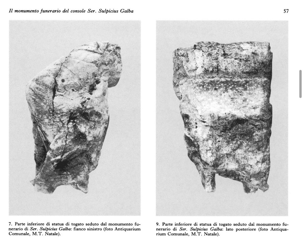Proviamo quindi a ricostruirla mentalmente : in basso, un grande basamento con il nome del defunto. Il alto una grande edicola, forse con colonne e timpano, con al centro la statua di Sulpicio Galba seduto, raffigurato alla maniera greca.